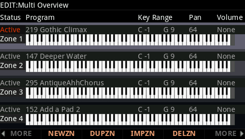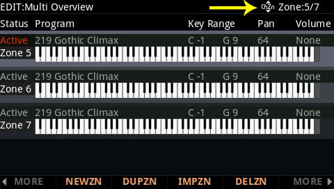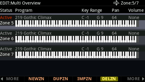 DUPZN = creates a new zone by duplicating the currently selected zone. IMPZN = creates a new zone by importing a zone from another Multi. DELZN = deletes the currently selected zone. |