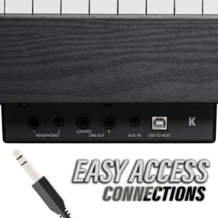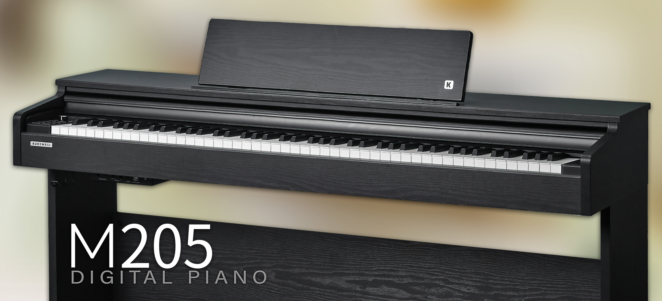 The M205 is powered by our KORE 1.0 128MB Sound Library, featuring optimized German D piano samples from our professional product line, alongside electric piano, harpsichord, organ, clav, strings, and more.
